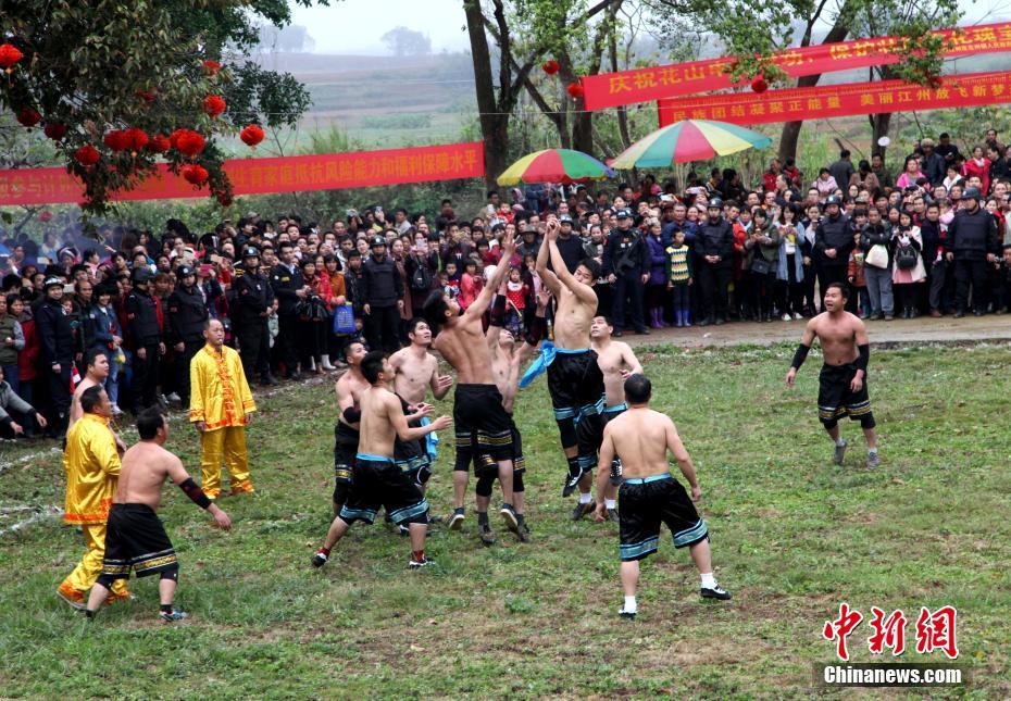 3月16日,具有500多年历史的“金山花炮节”在广西崇左市江州区左州镇举办,当地壮族民众举行抢花炮比赛,场面热闹。“金山花炮节”源于明朝成化十四年,每年农历二月十九日,左州镇全镇舞龙狮、会山歌、抢花炮,人山人海。这一民俗节庆已被列入广西壮族自治区非物质文化遗产名录。图为抢花炮比赛现场。中新社记者 杨志雄 摄