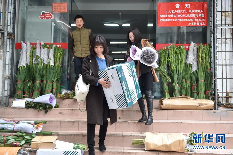3月18日,陈莹莹(前)和吴佳英在花材市场搬运购买的花材。新华社记者 宋为伟 摄