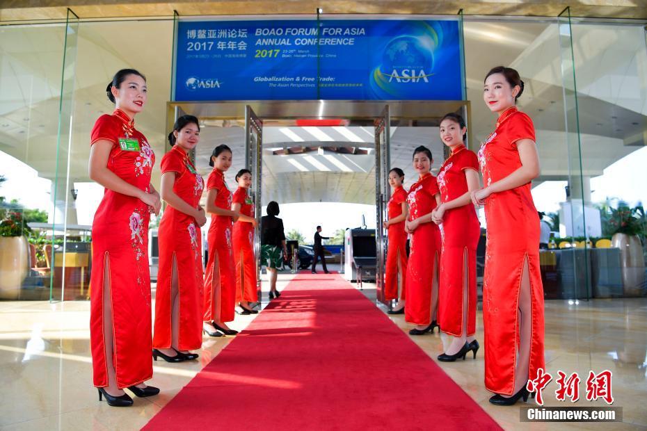 3月22日,身着红旗旗袍的礼仪工作人员在博鳌亚洲论坛大酒店门口迎接宾客。据了解,博鳌亚洲论坛2017年年会将于23日至26日在海南博鳌召开,主题为“直面全球化与自由贸易的未来”。设置42场分论坛,12场闭门对话,形式多样,内容丰富,议题广泛。中新社记者 骆云飞 摄