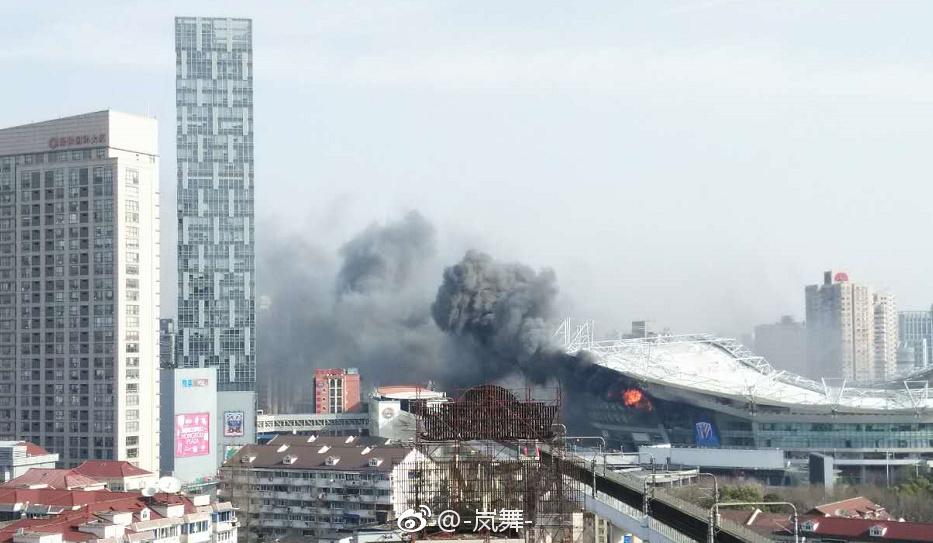 3月28日早上,上海虹口足球场突然起火。网友的照片显示,现场明火较大。