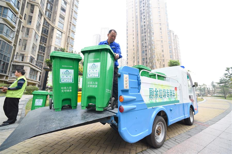 3月29日,厦门市天湖城小区保洁员杨永生在收集厨余分类垃圾。当日,厦门市垃圾分类示范小区海沧天湖城小区内,79岁的邱彩仙阿姨将一袋厨余垃圾投放至小区厨余垃圾分类箱,随后这袋垃圾被厨余垃圾专用车转运至厦门市垃圾分类处理厂。在这里经过流水线分拣后,其中剩菜剩饭等有机物被输送至厌氧发酵间发酵产生甲烷气体燃烧发电,而塑料、纸张等可燃垃圾被再次转运至附近的厦门后坑垃圾焚烧发电厂进行焚烧发电。至此,邱阿姨这袋厨余分类垃圾完成了“变身之旅”,被转化为可利用的电能。据了解,厦门目前日产各类垃圾5000余吨,其中约1800余吨被用来焚烧发电,2600余吨被压缩填埋,剩下的约600余吨厨余分类垃圾被进行生物质能转换再生利用。近年来,厦门市稳步推进垃圾分类工作,正加快建立分类投放、分类收集、分类运输、分类处理的生活垃圾分类处理系统,并通过设立的19个垃圾分类示范小区和学校垃圾分类教育,宣传垃圾分类的重要性,提高全民参与热情。新华社记者姜克红摄