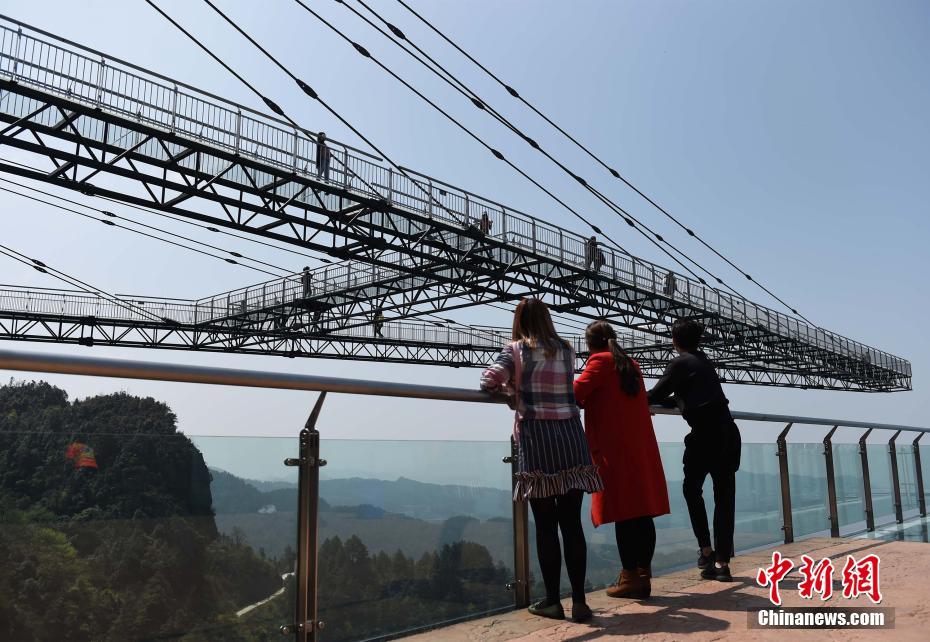 4月6日,重庆一景区内“天空悬廊”吸引众多市民前往体验。悬廊成“A”字形,桥面铺设全透明玻璃,由于悬空于近300米高的悬崖峭壁之上,又沿悬崖向外延伸在80米的空中,因此取名为“天空悬廊”。相比美国科罗拉多观景廊桥向外悬挑21米,天空悬廊向外悬挑80米更为惊险刺激。目前,该项目正在申请吉尼斯世界纪录。周毅 摄