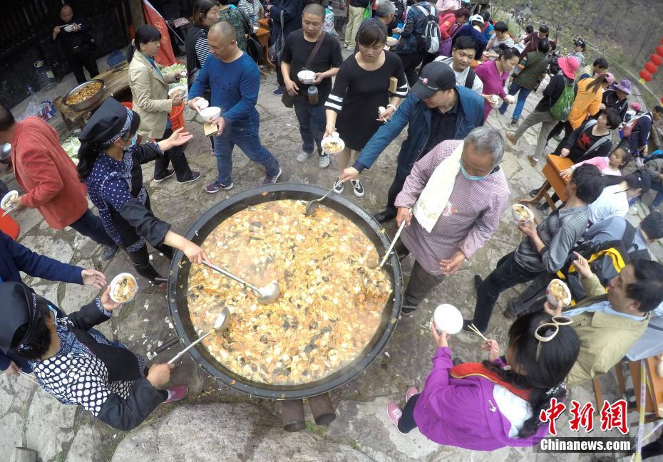 4月15日,三千余名民众汇集河南济源愚公故里的小沟背愚公村,共吃自助“大锅饭”,感受部落生活,体验农耕气息。当日,六七口大锅、十几个大盆一字排开,劈柴烧出热腾腾的大锅饭吸引大批民众一起大快朵颐。中新社记者 王中举 摄