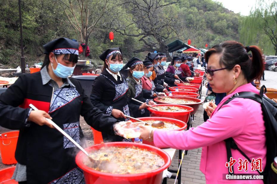 4月15日,三千余名民众汇集河南济源愚公故里的小沟背愚公村,共吃自助“大锅饭”,感受部落生活,体验农耕气息。当日,六七口大锅、十几个大盆一字排开,劈柴烧出热腾腾的大锅饭吸引大批民众一起大快朵颐。中新社记者 王中举 摄