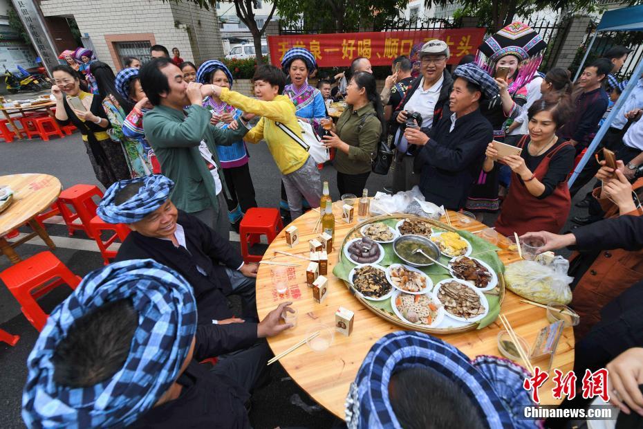 4月17日,四方宾朋在广西百色市田林县千人百家宴上用餐。当日,田林县以壮家最高礼仪迎接和款待前来参加2017年田林县“壮族三月三·吼敢”壮剧节的宾客。中新社记者胡雁 摄