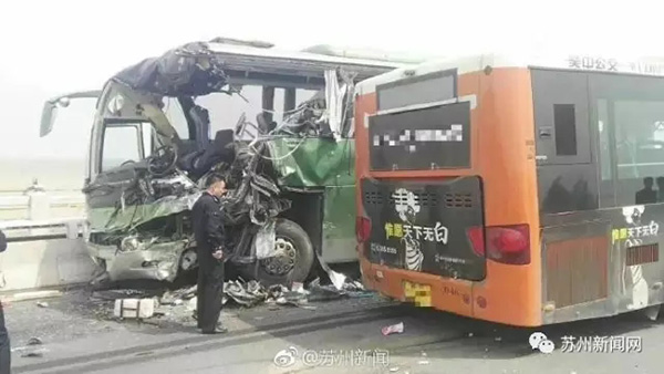 据无线苏州客户端消息,苏州太湖大桥发生的车祸目前已致1人死亡,39人受伤。其中38名伤者送往木渎人民医院救治,1人被送往附一院,1人被送往附二院。送往附一院救治的伤者已死亡,正在附二院接受治疗的伤者伤势较重。送往木渎人民医院的38名伤者中,1人伤势较重,8人皮外伤已离院,其他伤者多数为骨折、皮肤裂伤,正留院观察。