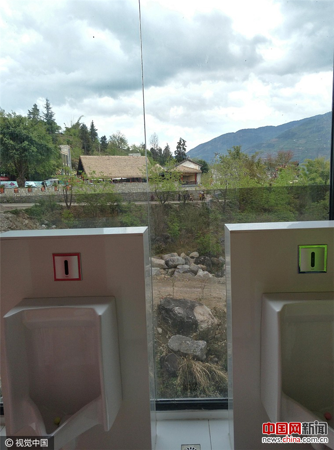 2017年4月7日,云南大理石门关景区,有一座造型新颖美观、占地面积小、移动灵活、并可重复移动使用集装箱房式设计的180度无死角透明观景厕所,总面积约160余平方米。厕所外观落地玻璃采用单透膜,让游客边上厕所,还可以边欣赏景区优美的风景。李明/视觉中国