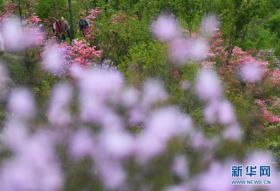 4月21日,游人在天马寨的杜鹃花海中游览。