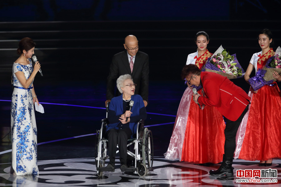 谭咏麟献花献唱 致敬老一辈电影人秦怡和罗家英