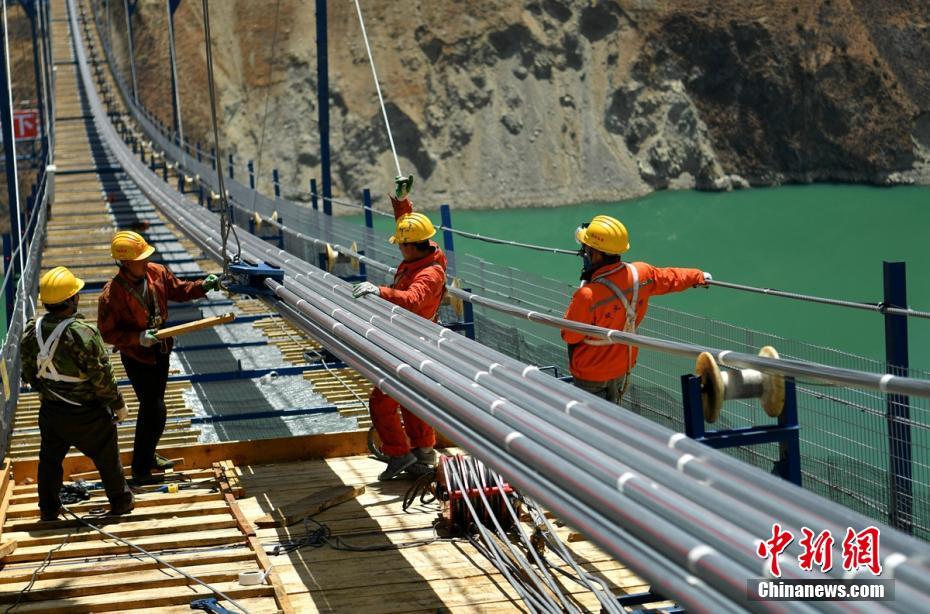 约400米高的大渡河上空,正在“猫道”上施工作业的工人师傅。刘忠俊 摄