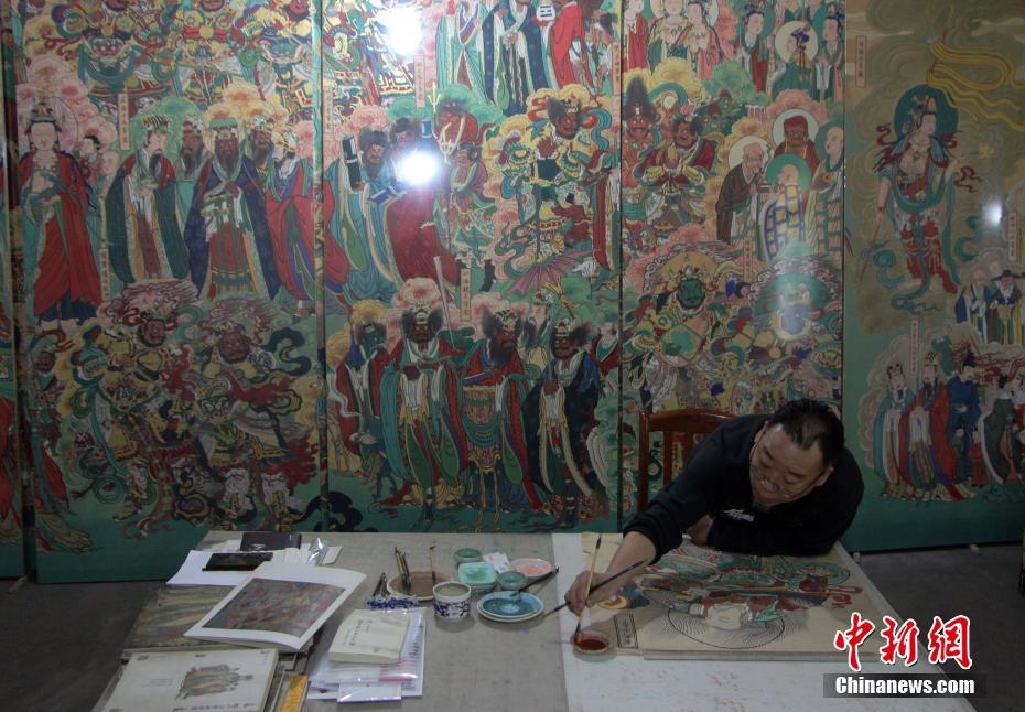 4月25日,在河北省石家庄燕赵艺术市场的一间画室内,姚淑龙正在做临摹练笔。自幼酷爱绘画的姚淑龙,前后花了10年时间,用传统壁画的技法将毗卢寺六面墙的壁画全部临摹下来。这些临摹的壁画被固定在28块木板上,每块高2.8米、宽约0.7米,所有木板拼起来就是毗卢寺六面墙的全部壁画,大约200多平方米。毗卢寺位于河北省石家庄市西北,始建于唐天宝年间,以存有明代精美的宗教壁画而驰名中外。中新社记者 韩冰 摄