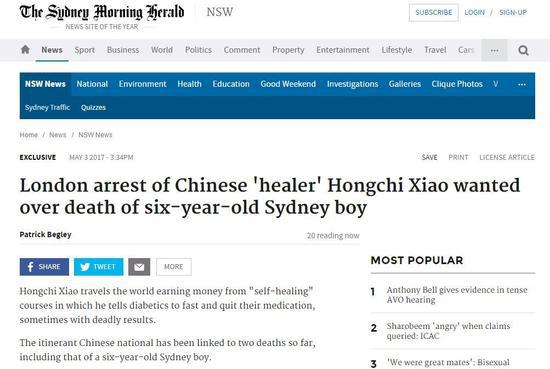 据《悉尼先驱晨报》报道,应澳大利亚方面的请求,英国伦敦警方上个月末抓捕了中国“拍打拉筋自愈法大师”萧宏慈,现在其被关押在伦敦。据悉,澳大利亚当局正在寻求引渡萧宏慈,以便六月份在新南威尔士州举行指控他犯过失杀人罪的庭审。