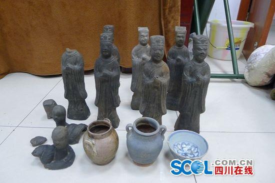 4月27日上午,都江堰火车站安检口一个行李箱引起了值班安检员的注意,该行李箱的X光机图像上竟然出现了6、7个疑似人偶的图像,人偶面部轮廓的阴影特别清晰。警觉的安检员立即锁定这个箱子,当即向当班民警报告。民警迅速赶到现场,当场对可疑行李箱进行查验。打开行李箱,赫然入目的是6、7个带有历史印迹的陶俑雕像和2个陶罐,一看就是有年头的物件。
