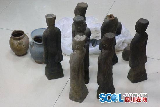 为了摸清陶俑和陶罐的真实身份,都江堰车站派出所立即将行李的主人张某拦下,并与都江堰市文物局工作人员取得联系。经市文物局工作人员现场鉴定,该男子行李箱中物品确为文物,其中包括南宋陶俑8个、南宋双耳陶罐2个,清初青花瓷碗1个。张某承认是从一处工地挖出了8个陶俑和2个陶罐,带回家中藏匿。在家猫了十几天,看着没有风吹草动了就想把这些“宝贝”带到成都出手,大赚一笔,谁知还没上车就露了馅儿,被抓个正着。目前,该案件正在进一步办理中。