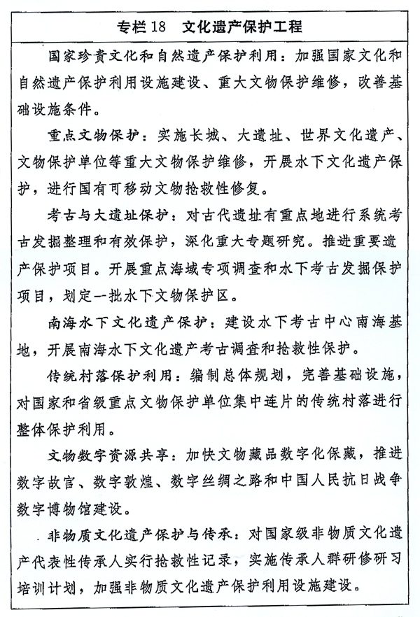 (三)加强文化遗产保护。大力强化全社会文物保护意识,加强世界文化遗产、文物保护单位、大遗址、国家考古遗址公园、重要工业遗址、历史文化名城名镇名村和非物质文化遗产等珍贵遗产资源保护,推动遗产资源合理利用。加强馆藏文物保护和修复。建立健全国家文物督察制度,完善文物登录制度。规范文物流通市场,加大非法流失海外中国文物追索力度。加强考古发掘和整理研究。健全非物质文化遗产保护制度。加强国家级文化生态保护实验区建设,支持非物质文化遗产展览、展示、传习场所建设。推进非物质文化遗产生产性保护。
