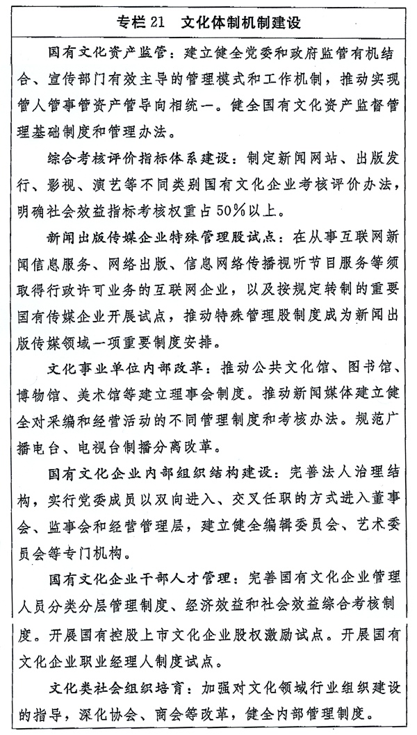 (三)深化文化事业单位改革。分类推进文化事业单位改革,进一步明确不同单位的功能定位。深化人事、收入分配、社会保障、经费保障等制度改革,加强绩效评估考核。推动公共文化馆、图书馆、博物馆、美术馆等建立事业单位法人治理结构。加大对党报党刊、通讯社、电台电视台、时政类报刊社、公益性出版社等主流媒体扶持力度,加强内部管理,严格实行采编与经营分开,规范经营活动。在坚持出版权、播出权特许经营前提下,允许制作和出版、制作和播出分开。