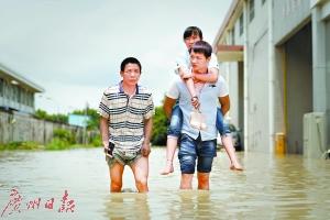 花都区花东镇洛场村受灾严重,村民互助走出被洪水围困的村庄。