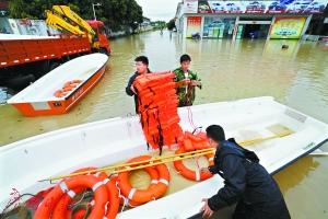 花都区花东镇洛场村,三防人员出动冲锋舟进村救援受洪水围困的村民。