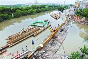 白云区夏茅村,目前工作人员架起临时的钢铁堤坝正在排水。