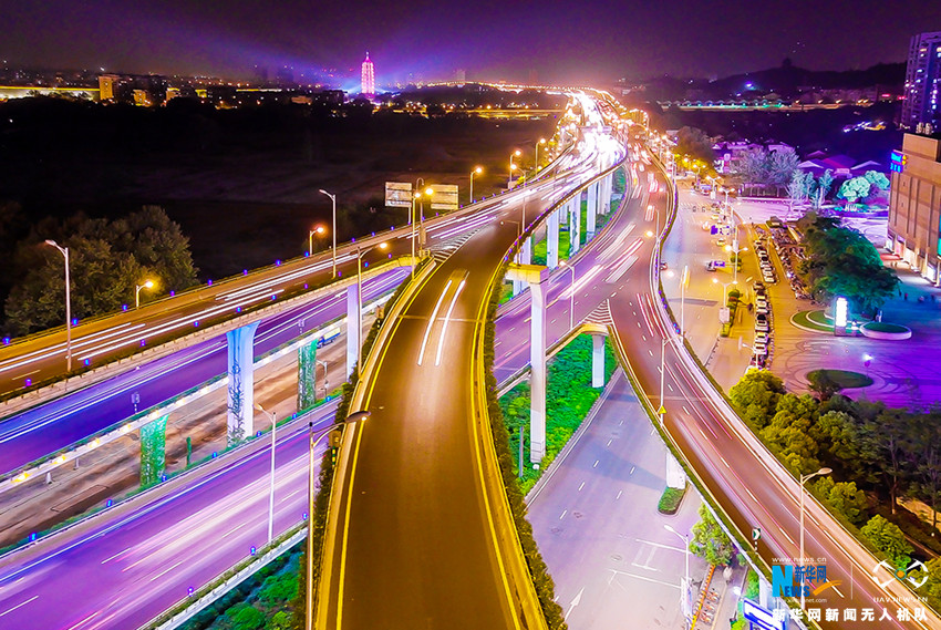 夜幕下的立交桥幻化成一只“火凤凰”飞越金陵古城。新华网发(席航飞 唐杨摄)