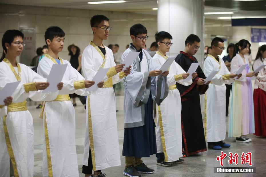 5月10日,来自南京知语轩的五十多位青年志愿者身着汉服,通过在地铁站台进行朗诵、汉服展示、在车厢内阅读等形式,向市民宣传阅读。据悉,该活动由江苏省全民阅读办指导,南京市全民阅读办主办,主题为“阅书香,悦人文”。中新社记者泱波 摄