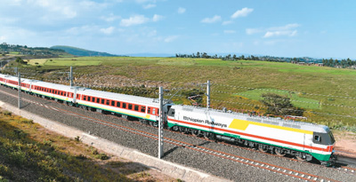 二〇一六年十月三日,在埃塞俄比亚首都亚的斯亚贝巴附近,一列试运行列车在亚吉铁路上行驶。该项目是继坦赞铁路之后,中国在非洲修建的又一条跨国铁路,被誉为“新时期的坦赞铁路”。
