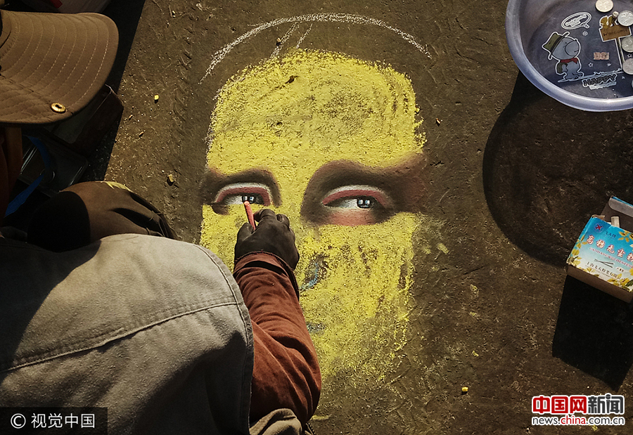 记者观察发现,“流浪者”身边,一盒无尘粉笔和一个小塑料盆摆在地面上,小塑料盆中扔着几枚一块钱硬币,而专心低头绘画的男子,丝毫不受围观者的影响,其创作当中,也不拿临摹的画本,全屏记忆进行着自己的创作。