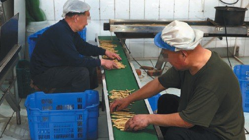 5月3日,北京祥隆宫食品有限公司第一分公司,工人直接用手整理辣条半成品。