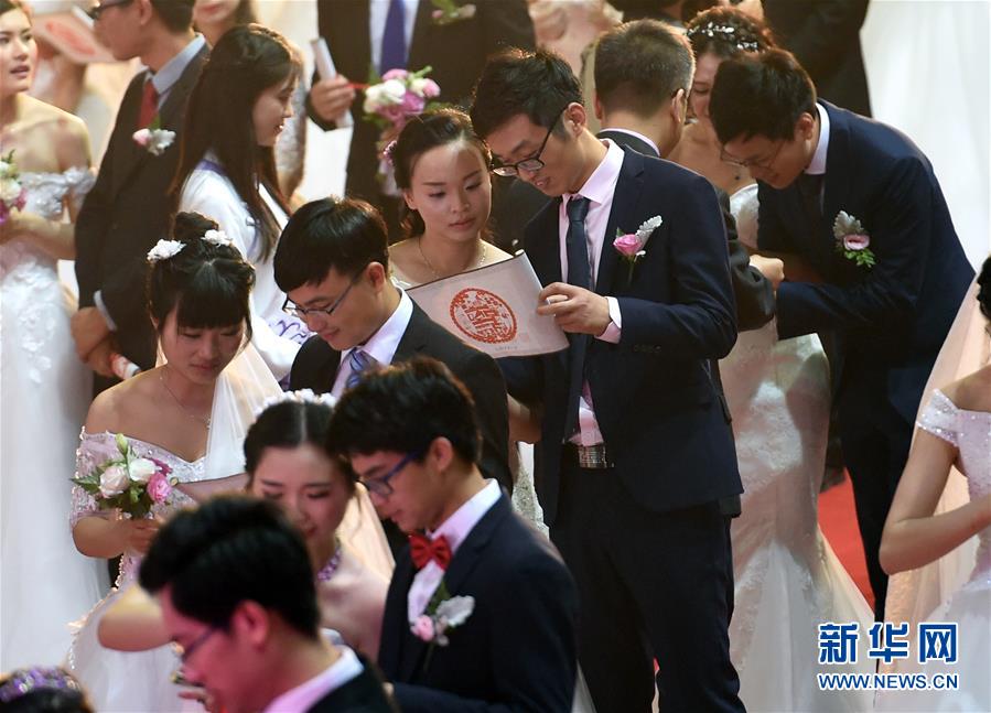 5月20日,新人们领到学校颁发的“南大版结婚证书”。当日是南京大学建校115周年校庆日,115对新人在学校体育馆举行校园集体婚礼。新华社记者 孙参 摄
