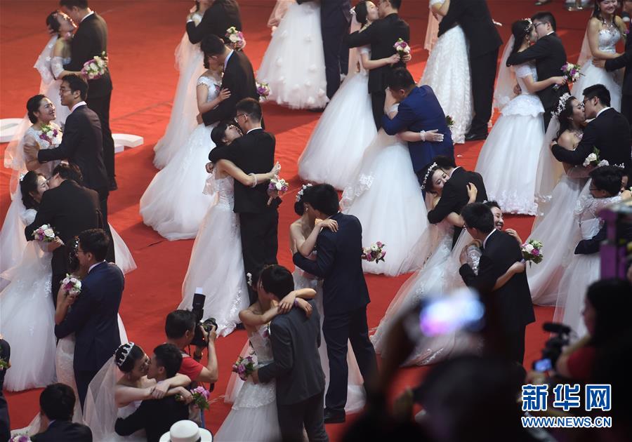 5月20日,新郎和新娘在婚礼上拥抱。当日是南京大学建校115周年校庆日,115对新人在学校体育馆举行校园集体婚礼。 新华社记者 孙参摄