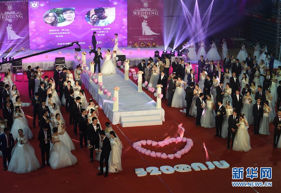 这是5月20日拍摄的校园集体婚礼现场。当日是南京大学建校115周年校庆日,115对新人在学校体育馆举行校园集体婚礼。 新华社记者 孙参摄