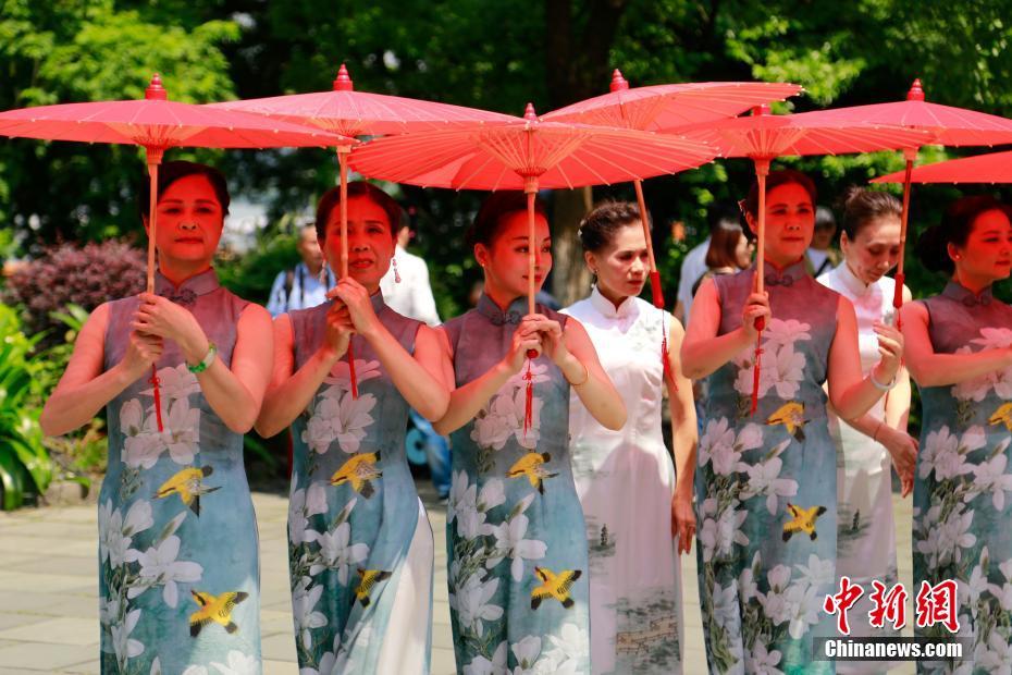 国内外女士着旗袍在杭州展示“旗袍之美”
