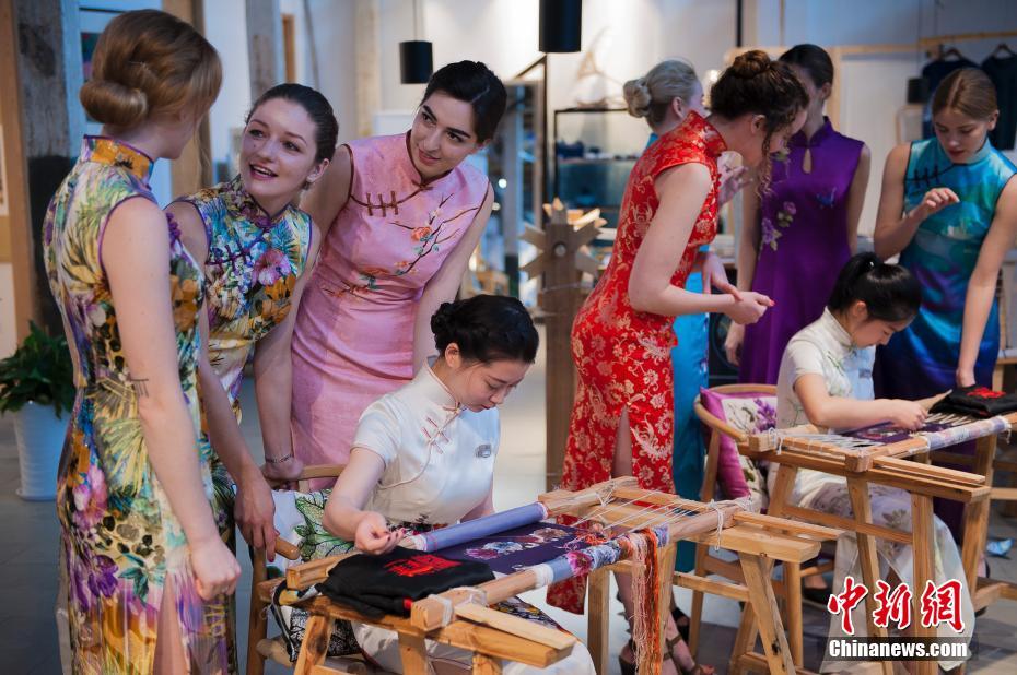 5月26日,一些身着旗袍的外籍友人在杭州手工艺活态馆观看杭州手绣展示。当天,2017杭州全球旗袍日主场活动在浙江杭州西湖边、京杭大运河拱宸桥以及中国丝绸博物馆三处举行。中新社记者沈柯辛 摄
