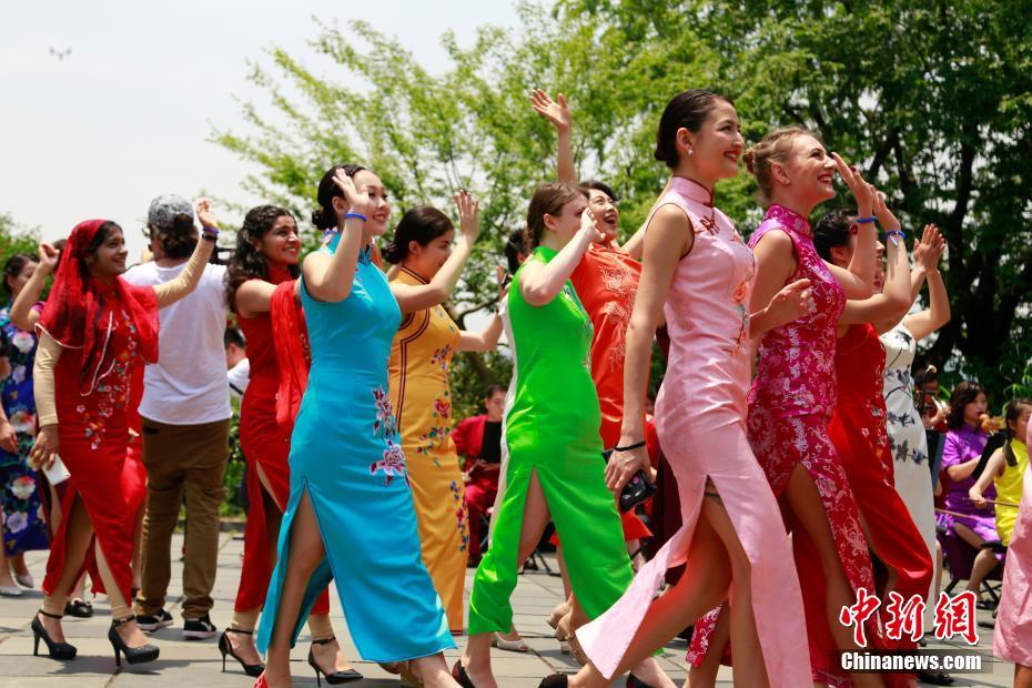 国内外女士着旗袍在杭州展示“旗袍之美”