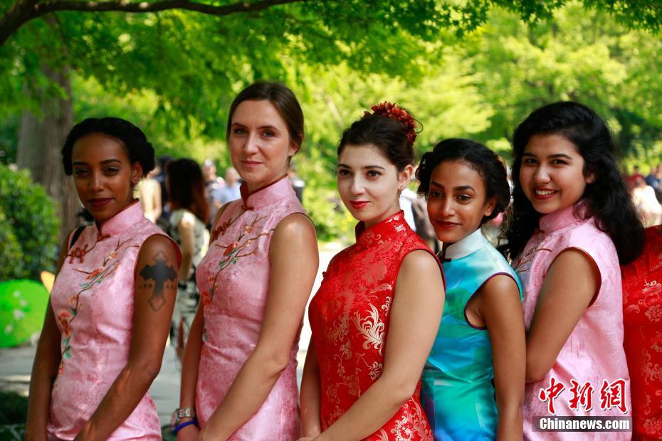 国内外女士着旗袍在杭州展示“旗袍之美”