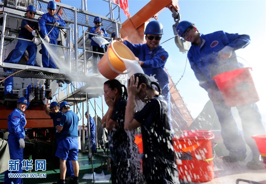 5月27日,女科学家张维佳和女潜航学员赵晟娅归来受到“洗礼”。 新华社记者 刘诗平 摄