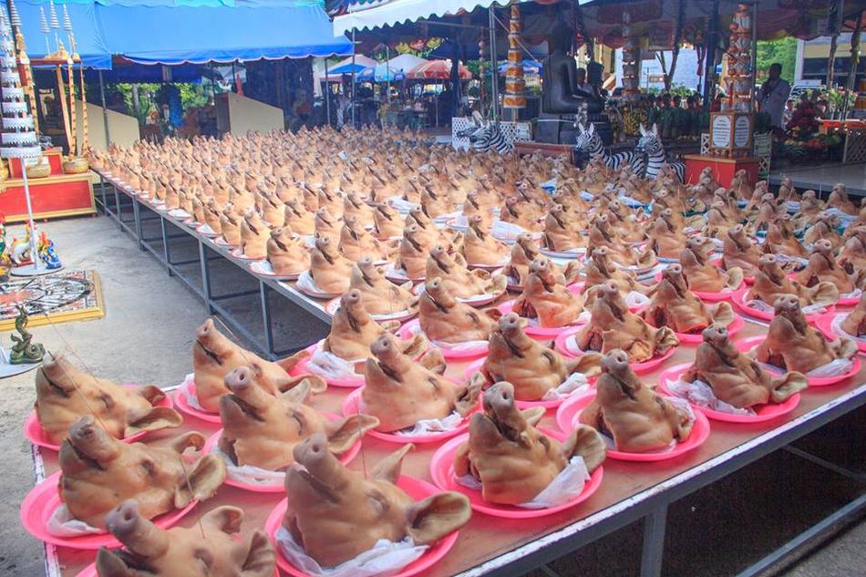 5月30日报道,近日,泰国佛统府一位从事建筑行业的包工头罗容,在那空猜斯甘邦帕寺庙摆了500个猪头还愿并免费送给民众,场面壮观。
