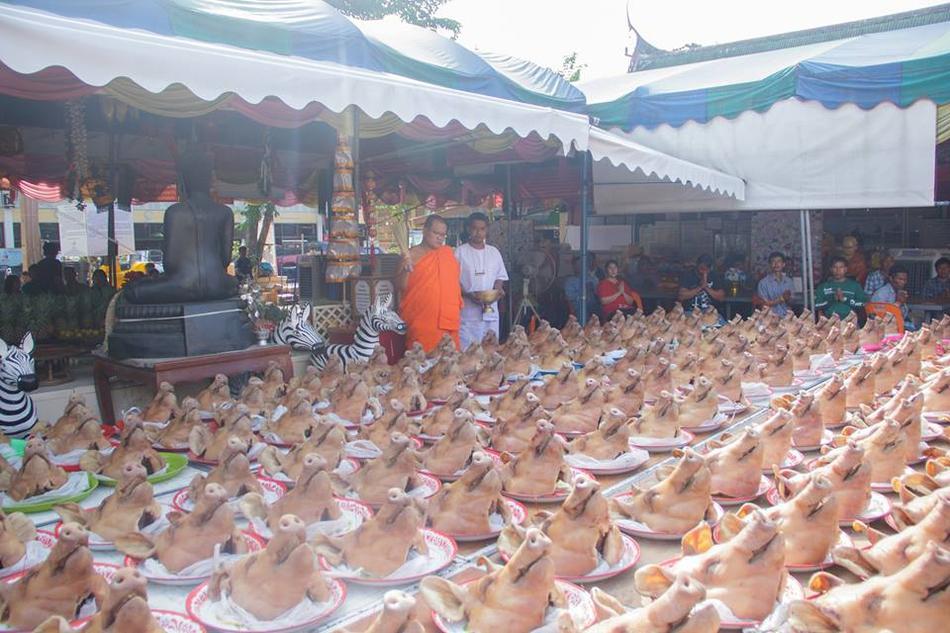 泰国包工头摆500只猪头还愿 免费送民众