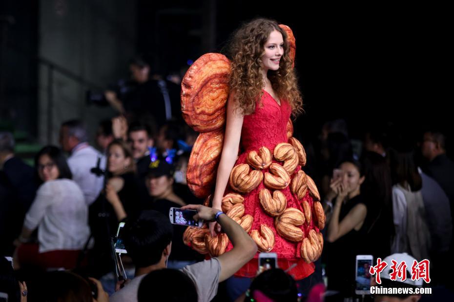 6月2日,模特在台上展示面包时装。当日,一场以“面包的童话”为主题的时装秀在北京上演,创意十足的面包礼服为观众带来一场视觉盛宴。中新社记者 熊然 摄