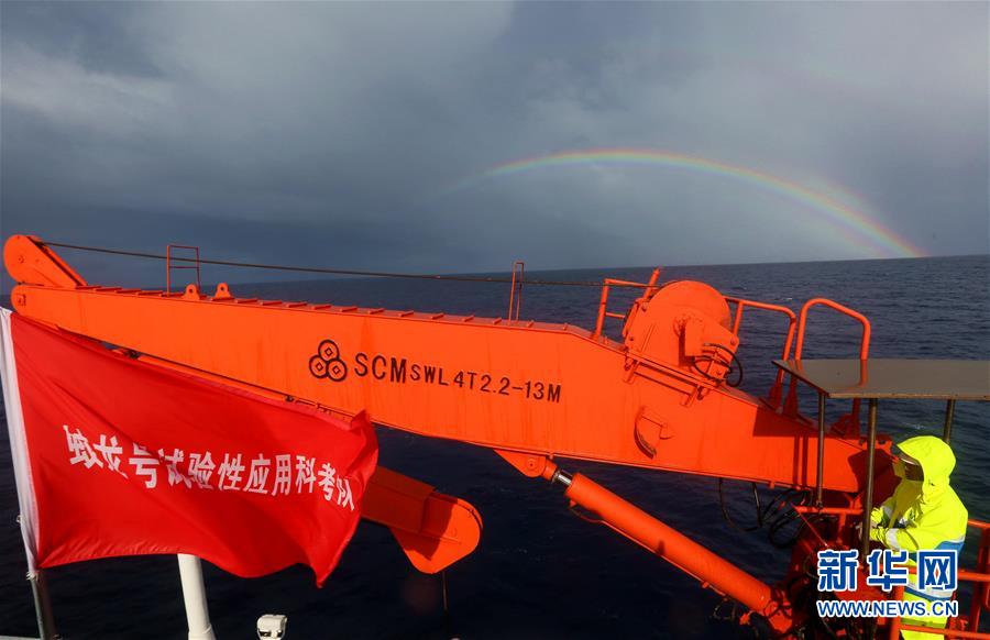 6月5日,工作人员布放水声吊阵设备,以保持潜水器与水面的通话和联系,彩虹出现在南方的天空中。不经历风雨,怎能见彩虹?历经风雨的“蛟龙”号载人潜水器,5日在风雨中下潜时“收获”了两道美丽的彩虹。这是中国大洋38航次第三航段的第7次下潜。继6月4日“蛟龙”号风雨中下潜太平洋雅浦海沟后,5日再次在风雨中出海。新华社记者 刘诗平摄