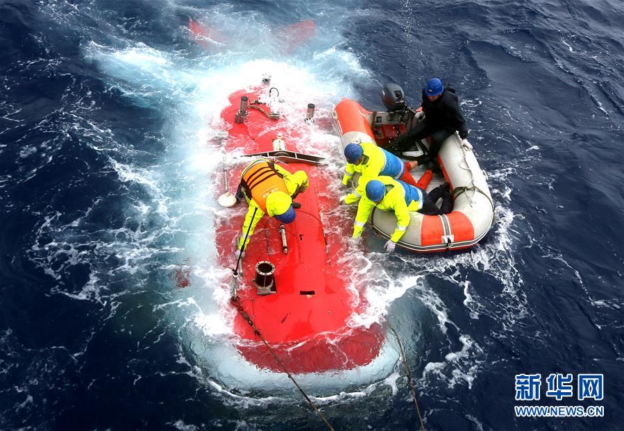 6月5日, “蛟龙”号载人潜水器进行太平洋雅浦海沟第2潜,“蛙人”解缆。不经历风雨,怎能见彩虹?历经风雨的“蛟龙”号载人潜水器,5日在风雨中下潜时“收获”了两道美丽的彩虹。这是中国大洋38航次第三航段的第7次下潜。继6月4日“蛟龙”号风雨中下潜太平洋雅浦海沟后,5日再次在风雨中出海。新华社记者 刘诗平摄