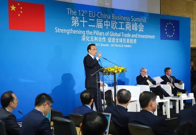 当地时间6月2日上午,李克强总理与欧盟委员会主席容克在比利时首都布鲁塞尔埃格蒙宫共同出席第十二届中欧工商峰会并发表演讲。新华社发