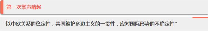李克强总理甫一讲出此行目的,立刻引来长久掌声。为什么?因为一下就直接触碰到了欧洲人目前最敏感的神经。美欧关系模棱两可的今天,英国脱欧进程仍在继续,多国大选频繁进行,民粹主义仍暗流涌动,再加上恐怖主义、难民危机、政府债务问题……每一件想起来都是头痛和不确定性,在这个时候,“稳定”发展的中欧关系,犹如冰雪天的暖阳,怎能不立刻打动人的心灵?