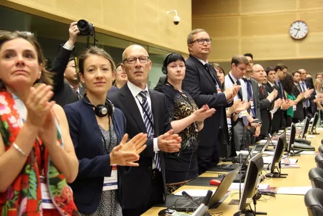 图为出席中欧工商峰会的与会者们纷纷起立鼓掌欢迎李克强总理的到来。吴刚 摄