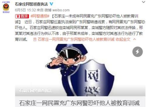 中国网6月6日讯 石家庄市公安局网络安全保卫支队官方微博5日发布通报,称有网民假冒广东网警恐吓他人称对方涉嫌诈骗,要求其三天内到公安局自首,并关闭全部网站。石家庄网警迅速锁定嫌疑人石家庄市栾城区邢某某,由于其尚未成年,栾城警方对其教育训诫。