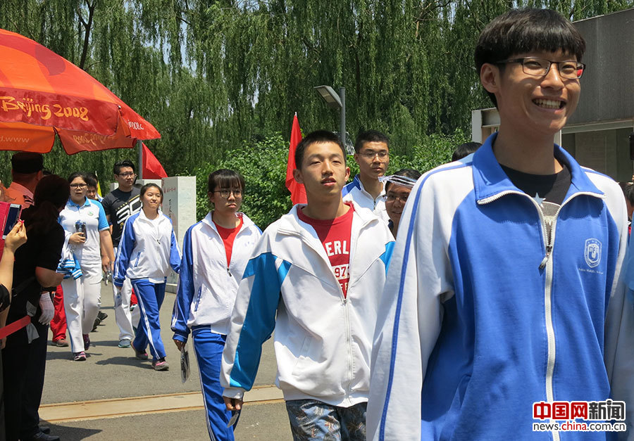 北京一零一中学考场考完语文的考生面对镜头主动微笑。中国网 蒋家乐 摄