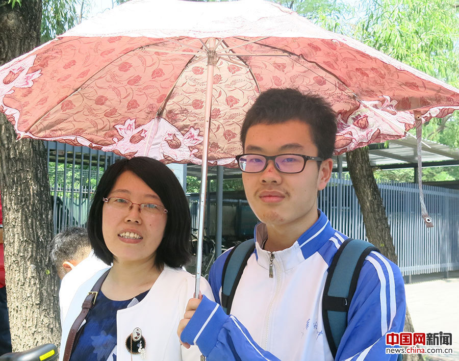 北京一零一中学考场考生,顾不上考试疲惫,主动给妈妈撑起遮阳伞。中国网 蒋家乐 摄