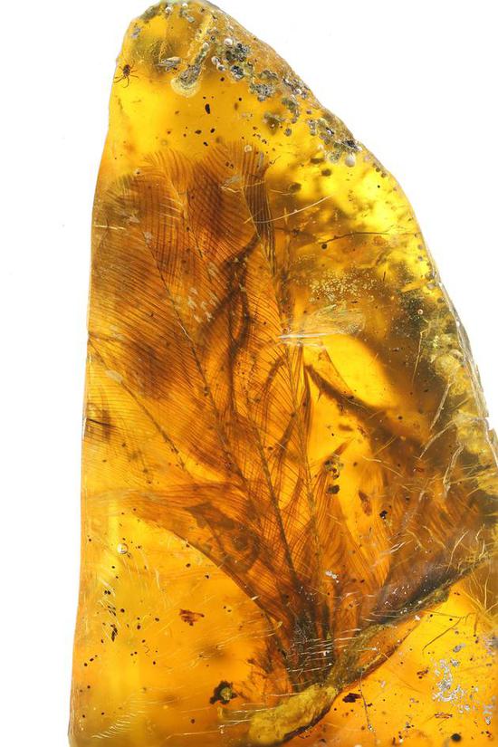 这件标本来自著名的琥珀产区之一,缅甸北部克钦邦胡康河谷。此地的琥珀距今约9900万年前,属于白垩纪中期的诺曼森阶。邢立达介绍:“这只小鸟体型娇小,从吻部到尾巴末端的长度约6厘米。当时它生活在缅甸北部潮湿的热带环境中,不幸被柏类或南洋杉类针叶树所流下的树脂包裹,在漫长的地质年代中形成琥珀,并一直保存至今。”图为比龙标本的翅膀。
