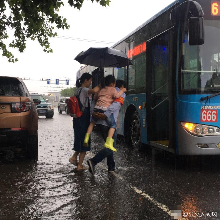 @公交人劲风,暴雨无情人有情。站台积水,孩子上车不方便,公交司机看到后把孩子背上车,赞一下这位好司机。