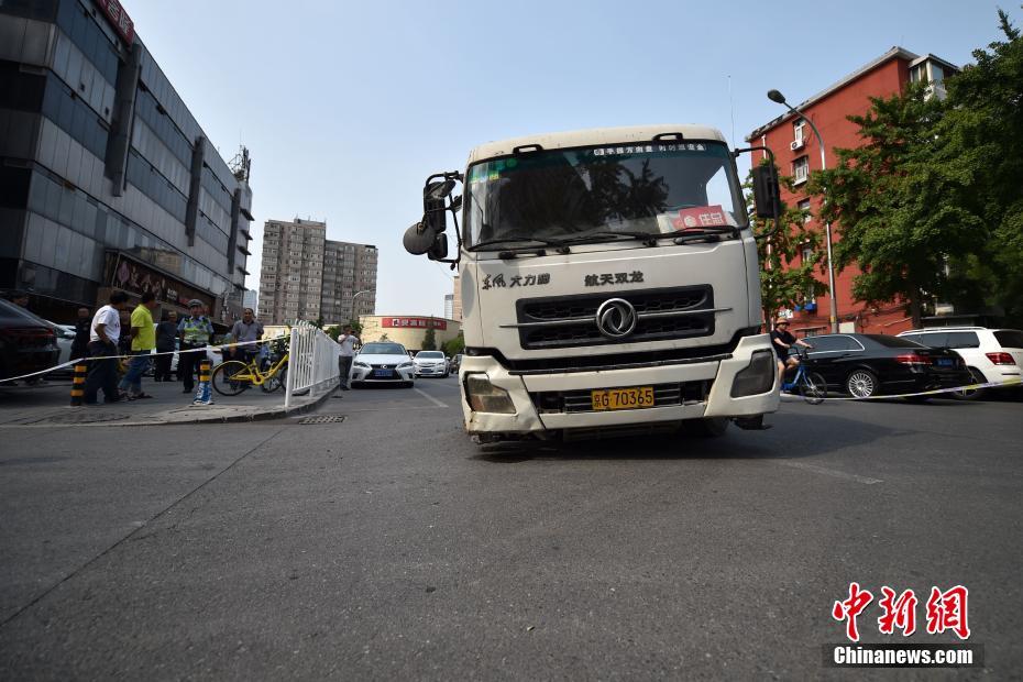 6月12日下午,北京市朝阳区新源街附近一水泥罐装车压塌马路,导致右前轮陷入无法继续行驶。目前,交警正对事故进行处理。 中新网记者 金硕摄